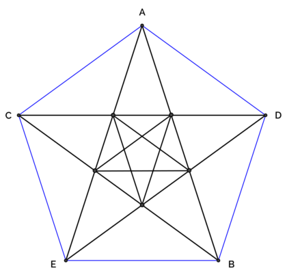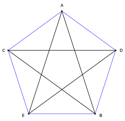 Se colleghiamo i vertici di un pentagono (poligono regolare con 5 lati e 5 angoli uguali) tracciando le cinque diagonali otteniamo un pentagono stellato (chiamato anche pentagramma, pentacolo o stella a cinque punte). Le diagonali a loro volta formano al centro un altro pentagono regolare di dimensioni più piccole e con la punta rivolta verso il basso. Lo stesso criterio può essere ripetuto seguendo lo stesso identico procedimento all’interno di questo ultimo pentagono, generando un ulteriore pentagramma e un ulteriore pentagono, con la punta che si alterna verso l’alto e verso il basso, e così va avanti all’infinito.