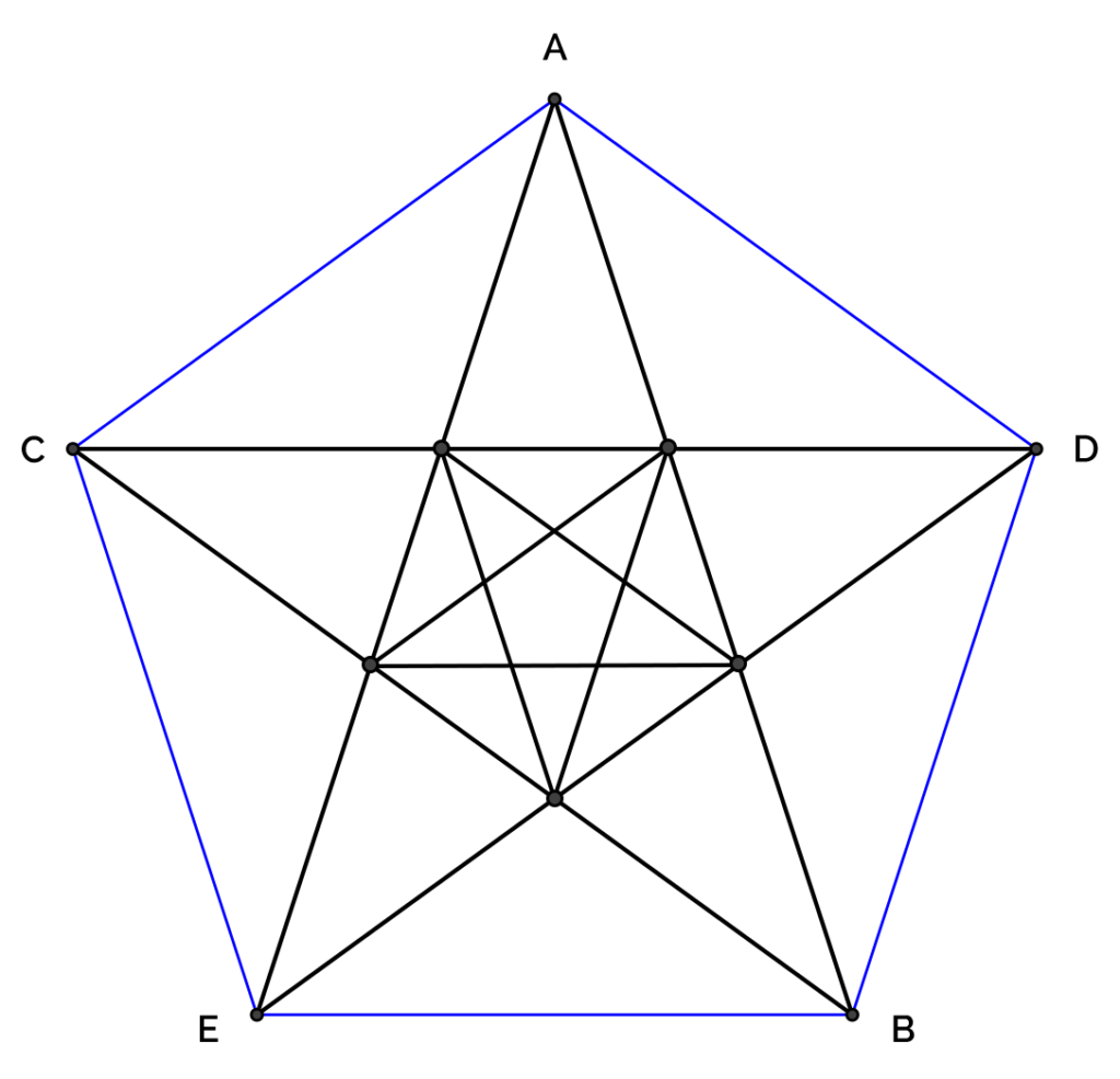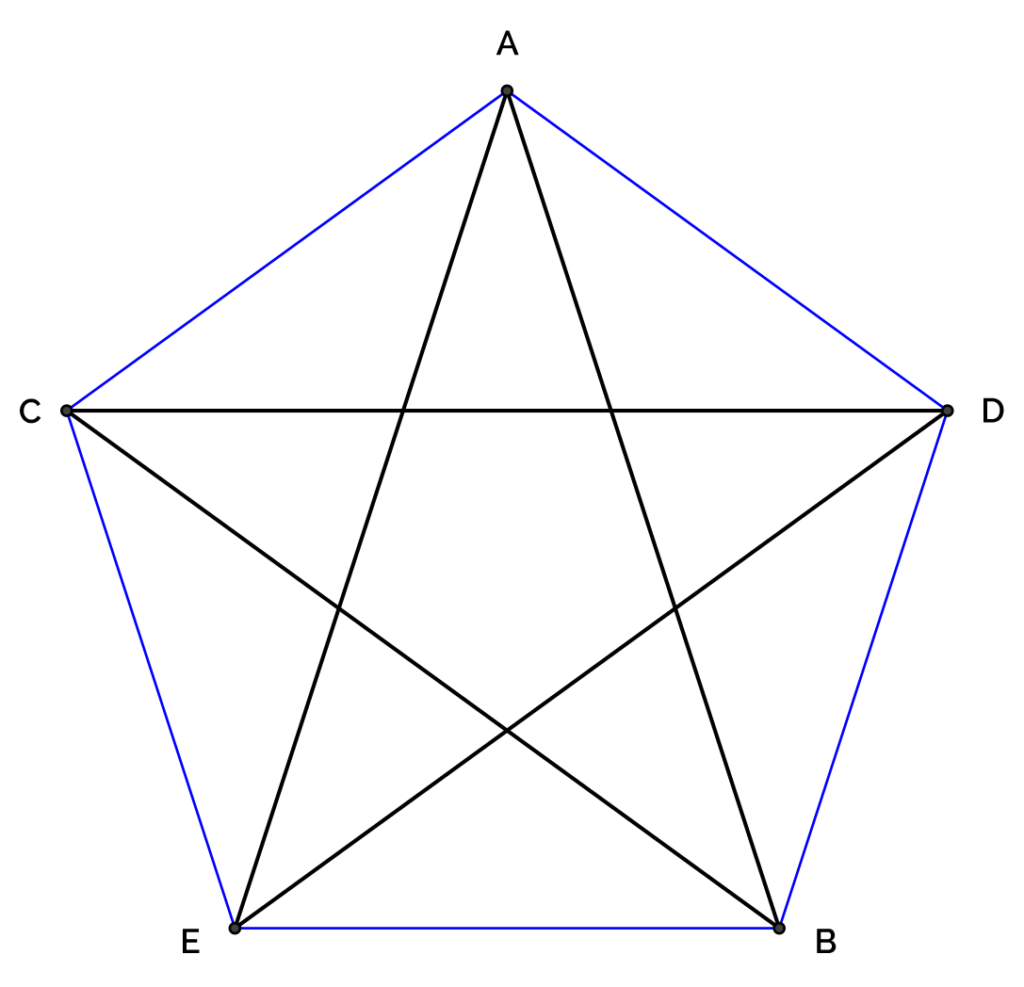 Se colleghiamo i vertici di un pentagono (poligono regolare con 5 lati e 5 angoli uguali) tracciando le cinque diagonali otteniamo un pentagono stellato (chiamato anche pentagramma, pentacolo o stella a cinque punte). Le diagonali a loro volta formano al centro un altro pentagono regolare di dimensioni più piccole e con la punta rivolta verso il basso. Lo stesso criterio può essere ripetuto seguendo lo stesso identico procedimento all’interno di questo ultimo pentagono, generando un ulteriore pentagramma e un ulteriore pentagono, con la punta che si alterna verso l’alto e verso il basso, e così va avanti all’infinito.