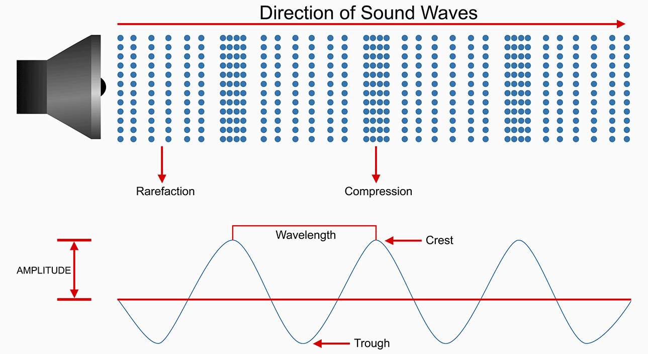 Ogni ciclo di un’onda sonora è composto da una fase di compressione, in cui la densità delle particelle del mezzo è maggiore rispetto alla loro posizione di equilibrio, seguita da una fase di rarefazione, in cui la densità delle particelle del mezzo è minore rispetto alla loro posizione di equilibrio. Per posizione di equilibrio si intende la condizione in cui le molecole del mezzo si trovano prima dell’inizio dell’onda sonora. Quando non vi sono variazioni di pressione o densità, il mezzo si trova nella sua posizione di equilibrio.”